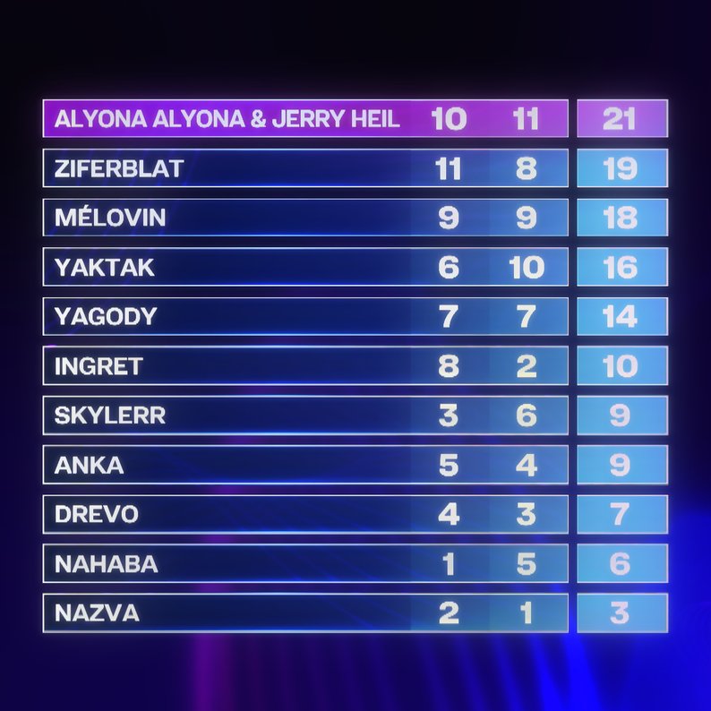 Дует alyona alyona & Jerry Heil отримав 10 балів від журі та 11 балів від глядачів. Відтак alyona alyona & Jerry Heil представлять Україну на пісенному конкурсі “Євробачення 2024” з піснею «Teresa & Maria». Пісня має певні релігійні мотиви.