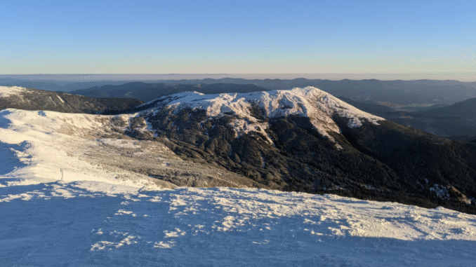 Сьогодні на горі Піп Іван температура знизилася до -8°. Небо ясне, але дме сильний західний вітер зі швидкістю 6 м/с.